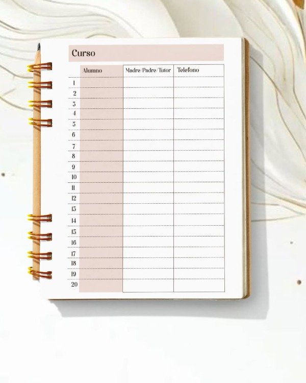 ✔ Espacios para 5 salones, con planillas específicas para asistencia, calificaciones y horarios.
